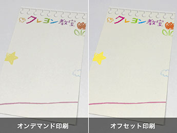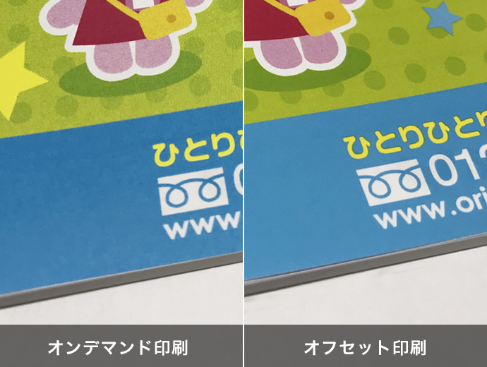 ・オンデマンド印刷はカラートナーによる印刷です。オフセット印刷とは印刷方式が異なっているため、データが同じであっても、両者の仕上がりは同じにはなりません。