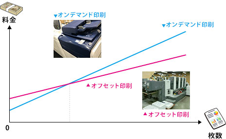 ある点を超えてからオフセット印刷の方が安くなります。
